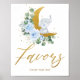 Este letreiro de mesa coordenado apresenta um adorável elefante bebê sentado em uma lua crescente adornada com flores azuis pastéis e folhagens. Itens correspondentes disponíveis na loja! (c) The Happy Cat Studio
