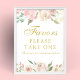 Um elegante poster floral para favores de casamento decorados com lindas rosas e peonias cor-de-rosa. Um sinal adorável para uma cerimônia de casamento de primavera ou jardim de verão escrita em um guião de ouro antigo chic. Por favor, pegue um.