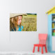 Menina num campo de trigo com aspas.
