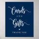Esta placa de casamento editável, com bela caligrafia "Cartões e Presentes" no tema da design azul de Marinho da rusticidade, é a decoração de casamento mais perfeita para o seu dia especial.