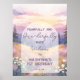 Boho and rustic Christian girl's first birthday design based on psalm 139 "Fearfully and Wonderfully Made" with a watercolor-style landscape with mountains, fir trees, wildflower meadow, and a rising sun in soft pastel colors of pink and purple.