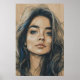 Esta arte mural apresenta um retrato impressionante de uma mulher cujo olhar confiante comanda atenção. Seus olhos azuis piercing são emoldurados por sobrancelhas ousadas e cabelos escuros fluidos, sutilmente esticados com pistas azuis que adicionam profundidade e intrigas. O trabalho de arte combina texturas semelhantes a esboços com sombreamento semelhante à vida, dando-lhe energia bruta e elegância refinada. Com uma expressão que irradia força e postura, essa peça capta a essência da autosegurança e da individualidade, fazer-a um ponto focal cativante para qualquer espaço.