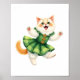 Esta encantadora impressão artística apresenta um adorável gatinho laranja de tabby vestindo um lindo vestido verde esmeralda com padrões celtas dourados. Os braços do gatinho estão levantados em celebração, língua saindo brincalhonamente, criando uma cena alegre e enérgica. Perfeito para adicionar charme e capricho a berçários, quartos de crianças ou qualquer espaço de amantes de gatos.