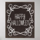 Um poster de sinal de Feliz Dia das Bruxas preto e branco, com o Halloween saudando dentro a teia de aranha.
