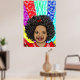 Uma menina afro-americana adorável rindo com cores brilhantes e ousadas, vermelha, roxa, amarela, azul-digital.