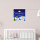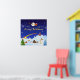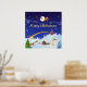 Bonitas paisagens de neve com árvores de Natal, casas, um homem de neve, uma igreja, e um arco-íris com flocos de neve caindo. Papai Noel voando sobre uma lua de cheio na noite de Natal.