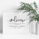 Bem-vindos convidados para o seu casamento com a nossa doce poster de criança, disponível em vários tamanhos. Design apresenta tipografia negra em branco nítido com "bem-vindo" no topo em um elegante roteiro de caligrafia manuscrito, e "...para a nossa alegria para sempre" e seus nomes e data de casamento abaixo.