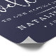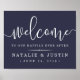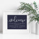 Bem-vindos convidados para o seu casamento com a nossa doce poster de criança, disponível em vários tamanhos. Design apresenta tipografia branca na sua escolha de cores de fundo com "bem-vindo" no topo em um elegante roteiro de caligrafia manuscrito, e "...para a nossa alegria para sempre" e seus nomes e data de casamento abaixo. Mostrada em azul-marinho rico da meia-noite.