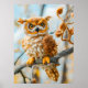 Uma coruja de feltro belamente trabalhada pendurada num galho resistente, mostrando detalhes complexos de pena e uma expressão sábia. A textura feita à mão traz calor a esta cena da floresta.