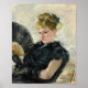 Femme À L’éventail (1876), de Berthe Morisot, é um retrato elegante de uma mulher que tem um fã, capturando a graça e o poste do sujeito com um talento impressionista assinado. A mulher, vestida com um belo vestido preto, é vista em perfil, segurando um fã aberto delicadamente em uma mão. As pinceladas suaves e fluidas e o uso de luz e sombra refletem a experiência de Morisot em transmitir humor e atmosfera. As cores ricas e a brincadeira de luz no rosto e no vestido da mulher criam um retrato sofisticado e íntimo da forma feminina num momento de silenciosa contemplação. Use as ferramentas de design para adicionar texto personalizado ou personalizar a imagem.