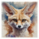Uma raposa Fennec, com uma aquarela pormenorizada com olhos expressivos, é representada contra um fundo macio e turvo. As cores naturais melhoram a aparência semelhante à vida.