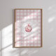 Poster de feriado clássico com um ornamento vermelho pintado à mão com fita e verde, colocado sobre um fundo de verificação de gingham rosa. Decoração festiva perfeita para comemorações de Natal, festas sazonais ou estilo de férias de fazenda.