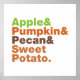 Apple & Pumpkin & Pecan & Sweet Potato. A Globe Trotters é especializada em imagens idiossincráticas de todo o mundo. Aqui você encontrará Cartões de Saudação, Cartões Postais, Posters, Capas de telefone, Adesivos, Mousepads e muito mais.