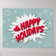 ilustração do estilo gibi Feliz Feriados com a campainha de Natal e a decoração dos flocos de neve em fundo azul