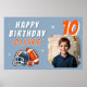 Poster de Festa de aniversário de Fotografias do Capacete de Futebol. Fundo de aniversário divertido e moderno. Apresentando uma ilustração ousada de um futebol e capacete em cor laranja e cinza. Adicione sua foto, nome e idade.
