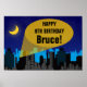 A luz de busca vigia a cidade procurando ajuda para salvar as pessoas da injustiça. Talvez o pequeno Aniversário seja o super herói para salvar o dia! Um horizonte divertido da cidade urbana na cena noturna em azul com lua amarela, faz um tema de Festa de aniversário excelente para crianças especialmente meninos que amam temas de super-heróis.