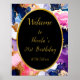 Bonito sinal de boas-vindas de aniversário com tinta rosa, marinho azul, roxa e dourada. As palavras podem ser alteradas para se adequarem aos seus próprios detalhes ou requisitos. Seria perfeito para um aniversário de qualquer idade.