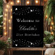 Um poster de boas-vindas para uma festa de aniversário de 21 ruas (ou qualquer idade) entre giros e glamourosos. Um fundo preto clássico decorado com estrelas de falso prata. Personalize e adicione um nome e idade 21. Cartas brancas.