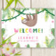 Celebre o aniversário do seu filho com este sinal de boas-vindas à festa de aniversário de preguiça! Com uma adorável preguiça pintada à mão em uma festa rosa e amarela pendurada na selva. Flores brancas, amarelas e cor-de-rosa decoram as folhas da selva. Todo o texto (exceto a palavra "bem-vindo") é personalizável em tamanho, fonte e cores!