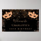 Poster festa de aniversário mascarada preto de ouro brilh