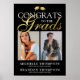 Poster de dupla graduação com uma imagem de cada um dos formandos, o texto "felicita os formandos", seus nomes, escola/faculdade e dois bonés de argamassa de folha de ouro falsos.