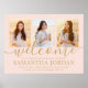 Adicione um toque personalizado às decorações da festa de formação do ensino médio ou universitário com um elegante cartaz de boas-vindas com colagem de 3 fotos, 18"x24". As imagens e toda a letra neste modelo de placa para download são fáceis de personalizar, e as cores são fáceis de alterar com a ferramenta de design da Zazzle. O design rosa e dourado apresenta caligrafia manuscrita da moda, tipografia minimalista moderna e chique, e três fotos de sua escolha, como fotos de formatura ou imagens da cerimônia de formatura. Por favor, note que o dourado é uma cor impressa, não é folha metálica. Este cartaz de formatura imprimível é uma maneira elegante de dar as boas-vindas a amigos e familiares para a celebração de um dia especial. Parabéns ao formando!