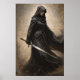 A hooded figure clad in flowing black robes holds a long, gleaming sword with a decorated hilt. The background features muted tones that enhance the dramatic and mysterious atmosphere.