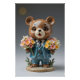 Uma bela cerâmica encantadora de um filhote de urso antropomórfico num estilo caprichoso e inspirado em chibi. O urso veste um terno azul, camisa branca, e gravata escura, com padrão, com pelo de cerâmica marrom brilhante e olhos grandes e expressivos, transmitindo admiração gentil. Fica em pé, segurando dois buquês coloridos de flores cerâmicas em rosa, amarelo e branco. A figurina repousa sobre uma simples base cerâmica com efeitos pintados delicados — um sol e céu macios, como a aquarela, e pequenas flores brotando aos seus pés. Terminada com esmaltes lisos e brilhantes, a peça expele calor, inocência e alegre apelo artesanal.