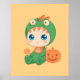 Bebê adorável vestida com uma fantasia de dragão verde com picos de laranja e combinando um bico de laranja com um crânio. Uma abóbora curvada fica um pouco para trás.