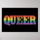Esta imagem retrororgulho gay tem a palavra "estranho" em letras do arco-íris com uma textura vestida.