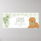 Celebre o ano de ouro do seu pequeno com este encantador banner de pôster de aniversário "Um Ano de Ouro"! Com um cachorrinho Goldendoodle feliz com um laço xadrez verde, fundo xadrez verde suave e balões em forma de pegadas de cachorro, este banner de pôster de primeiro aniversário personalizado traz o toque mais doce para a sua celebração.
