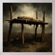 A shrouded figure lies atop a wooden platform under a moody sky, surrounded by sparse, dry grass. The scene conveys a sense of desolation and solitude in an open, barren landscape.