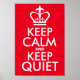 Mantenha calma poster, design, em vermelho e branco, com o texto "Fique calmo e fique quieto". Se você quiser mudar o plano de fundo de vermelho para qualquer outro, poderá alterá-lo usando o botão 'personalizá-lo'. É um poster perfeito para bibliotecas ou lugares onde o silêncio é necessário.