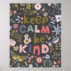 A arte timítica mostra a mensagem de "Fique calmo e seja gentil" em letras coloridas de arte popular com flores de jardim em fundo de cinza