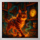 A mesmerizing fantasy artwork featuring a magnificent fire cat with flowing flame-like fur in vibrant oranges and reds. Set in a mystical library or workshop setting with an ornate clock and wise owl companion, this magical feline appears to be made of living fire and energy. Perfect for fantasy enthusiasts, cat lovers, and anyone who appreciates mystical and enchanted artwork with rich, warm colors and supernatural themes