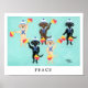 Flag Semaphore Labradors sending message of PEACE Poster for Labrador Fans. Five Labrador Retriever Sailors are sending Flag Signals. Each Flag Signal says P E A from left to right on the top and C E from left to right on the bottom. Whimsical Labrador Painting painted by Naomi Ochiai.