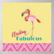 Um poster com uma ilustração gráfica de um flamingo rosa. O texto diz: Fabuloso. Tiras cor-de-rosa desenhadas à mão ao longo do fundo.
