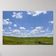 "Flint Colinas Ranch, Kansas" por Catherine Sherman. Nuvens de Fluffy cumulus num céu azul brilhante flutuam sobre o pasto verde numa fazenda de gado Flint Colinas no Kansas. As vacas negras pastam a grama. Um moinho de vento, lagoa, galpões e postes telefônicos somam a bela cena.