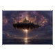 An immense floating island crowned by a grand, spired castle city gleams amid turbulent purple-orange clouds, with powerful golden light beams pouring downward to touch a serene ocean surface. Stars scatter across the night sky while a low sunset horizon warms the edges in peach and rose, creating layers of depth, mystery, and radiant energy. The composition evokes mythic grandeur, cosmic power, ancient legends reborn, sublime wonder, and the thrill of impossible realms—perfect for fantasy bedrooms, gaming rooms, meditation spaces, home offices, modern minimalist walls, or as awe-inspiring gifts for dreamers, fantasy enthusiasts, spiritual seekers, or anyone drawn to epic scale, surreal beauty, and transformative imagination.