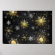 Fundo de Natal preto com flocos de neve de joias douradas e pretas. Flocos de neve ouro. Natal.