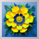 Flor vibrante e sobredimensionada feita de papel, mostrando uma combinação impressionante de cores. A flor tem pétalas grandes e arredondadas em amarelo brilhante, criando uma aparência ensolarada e alegre. No centro há um aglomerado de pétalas azuis menores ao redor de um núcleo amarelo brilhante, que adiciona profundidade e contraste ao design
