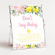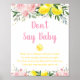 Este adorável Don't say Baby Game é uma maneira divertida e interativa de se divertir no seu Chá de fraldas e é garantido que é um grande sucesso! Basta mostrar este sinal bonito perto da entrada do chá de fraldas junto com uma cesta de pregos de roupa. Cada hóspede vestirá uma espinha de roupa. Quando ouvem outro hóspede dizer "Bebê", eles podem pegar sua espinha de roupa. Quem tem mais no final do chá ganha! O design apresenta limões coloridos de aquarelas, flores cor-de-rosa e confete de folha de ouro falso.