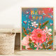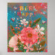 Florais coloridos vibrantes em um fundo azul verde mestiço com muitos detalhes sonhadores com palavras inspiradoras "Bee Happy". Arte de aquarela original. Coral pinça florais, com abelhas coloridas e salpicos de aquarela.
