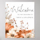 Florais de outono bem-vindos ao casamento. Ao lado de baixo e esquerdo, elegantes florais autóctones em tons de terracota, creme e castanhos, com Welcome em um roteiro elegante. Personalize facilmente o resto do texto.