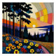 Uma I.A. criou a interpretação de um pôr do sol vibrante com feixes de luz laranja e amarela divide o céu acima de uma floresta de pinheiros silenciada. No primeiro plano, um campo de flores bem coloridas adiciona um contraste vivo às árvores escuras da paisagem distante.
