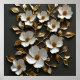 Desenho ornamentado com vários elementos florais artísticos. As flores são retratadas em branco com contornos dourados, mostrando detalhes intrincados nas pétalas e centros.