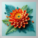 Flor vibrante e intrincadamente trabalhada feita de papel, apresentando pétalas laranja e amarelas brilhantes com um núcleo turquesa central.