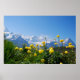 Esta incrível foto do Getty Images mostra a paisagem do campo com flores amarelas nos Alpes suíços em frente às famosas montanhas Eiger Monch Jungfrau perto de Grindelwald e Interlaken.