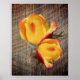 Bonito rosebudo amarelo com realce de laranja em um design de arte floral vestido em um quadro de pranchas por Susan. Visite Posters de tesouros de olhos sorridentes para ver mais fotos de flores e da natureza.