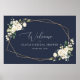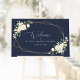 Adicione um toque pessoal à celebração do chá de noiva com esses itens de festa elegantes e memoráveis! O design apresenta flores em aquarela branca, folhagens e moldura dourada em fundo azul naval.
